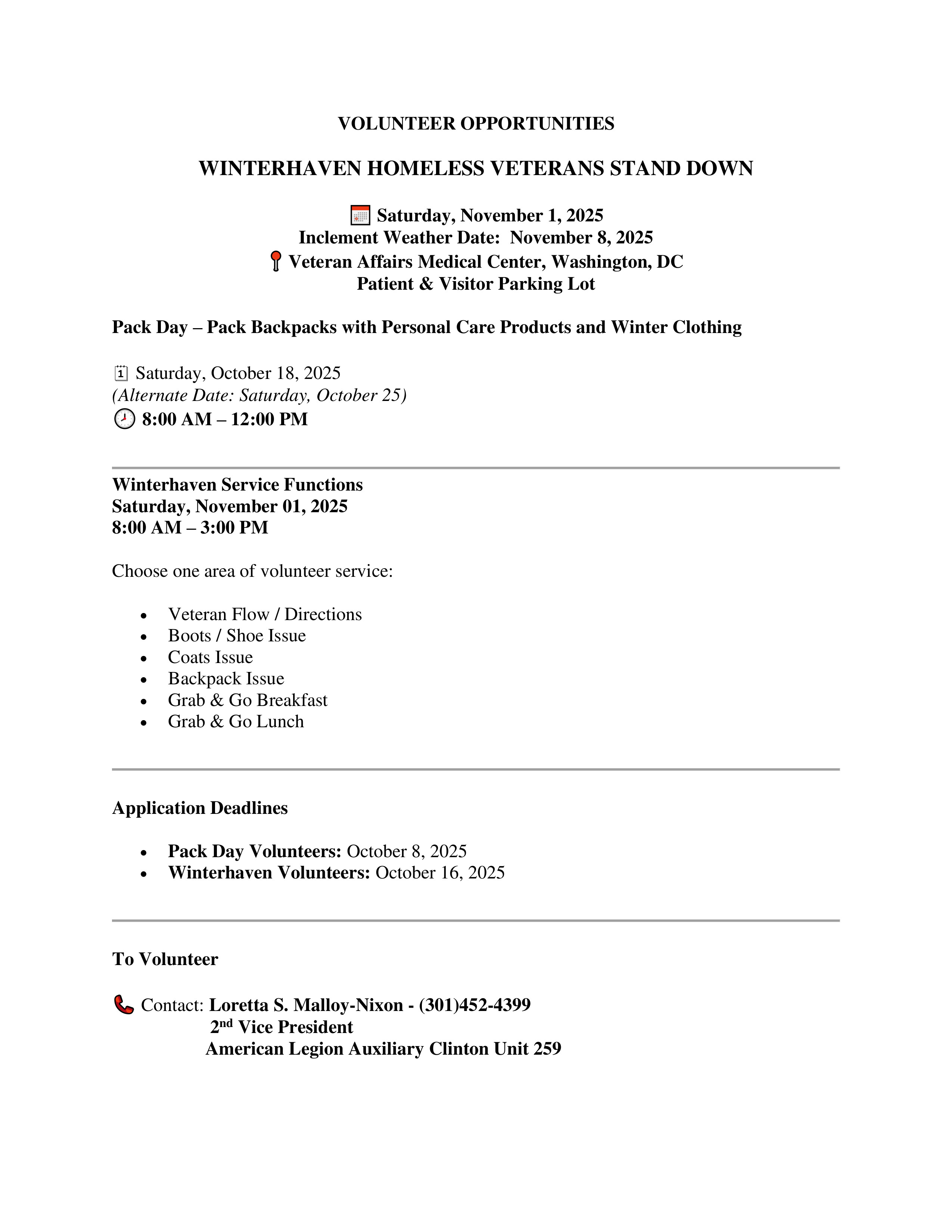 Volunteer Opportunities: Come help and support our in need homeless veterans in one of the following areas: